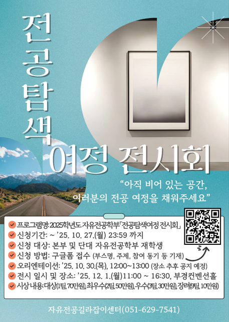 ▶「자유전공학부 전공탐색 여정 전시회」 부스 참여 모집◀ 여러분의 1년간의 전공탐색 여정을 함께 돌아보는 성과공유회, 전시회에서 도슨트가 되어 자신의 여정을 소개해보세요. -참여 대상: 자유전공학부 및 단과대학별 자유전공학부(개인전 또는 팀전(최대 4명)) -도슨트(전시회참여자) 모집 기간: 2025. 10. 27.(월) 23:59까지 -운영 기간: 2025. 10. 30.(목) ~ 11. 28.(금) -전시회 일시 및 장소: 2025. 12. 1.(월) 11:00 ~ 15:30 부경컨벤션홀 -시상 내역: