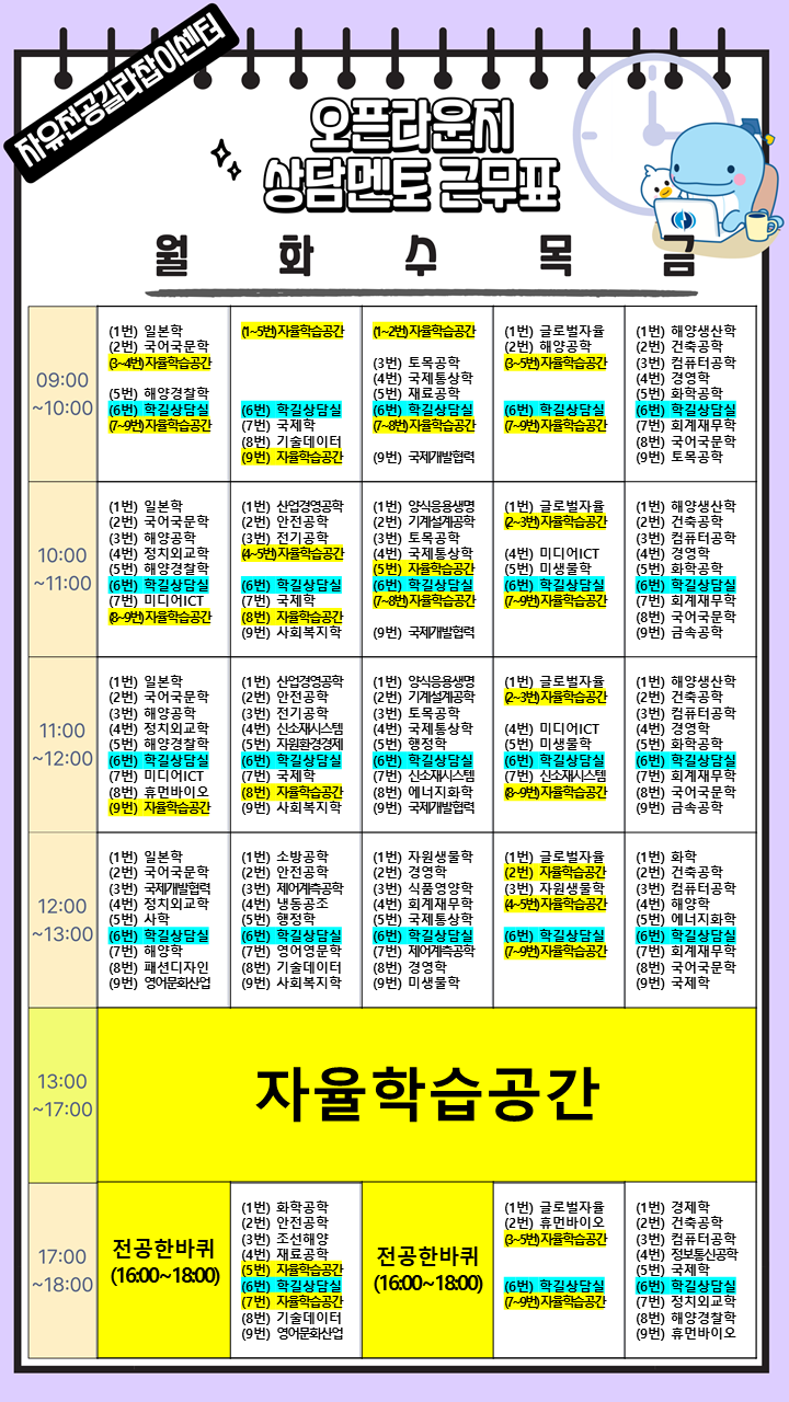 자유전공학부 오픈라운지 전공 상담시간표 공지 (3. 9. ~ 3. 13.)