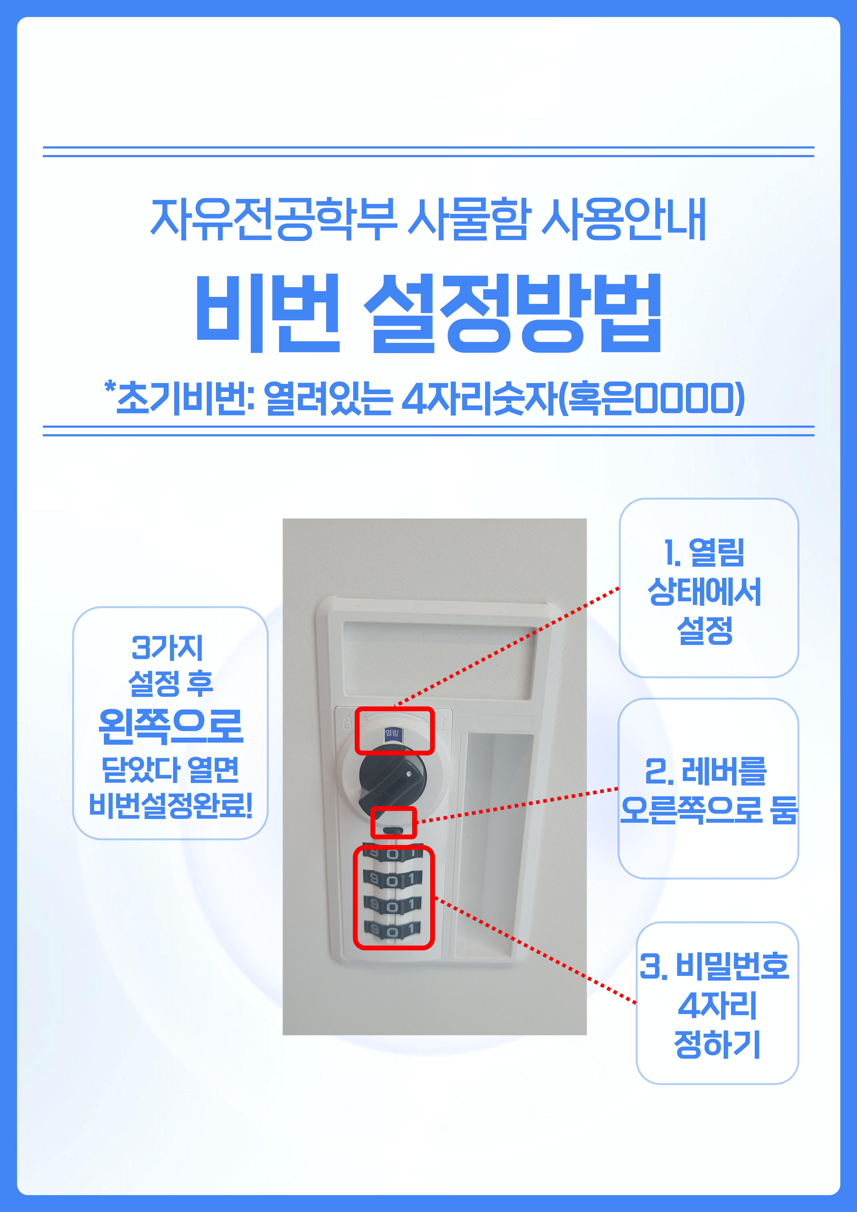 단과대학 자유전공학부 사물함 사용 안내드립니다. o 사물함 사용기간: 2026.03.13.(금)-2026.06.30.(수) 선착순배정완료 o 위치: 학술정보관 2층 자유전공 오픈라운지 내 -> 120-200번: 자유전공라운지 바깥쪽 복도 o 비밀번호 설정방법: 아래 및 첨부파일 참조 o 첨부파일 확인: 학번으로 검색후(Ctrl+F) 본인 사물함 배정 번호 확인(첨부파일 비번은 신청자 문자로 발송) o 사물함 사용관련 문의(jiyeon@pknu.ac.kr)