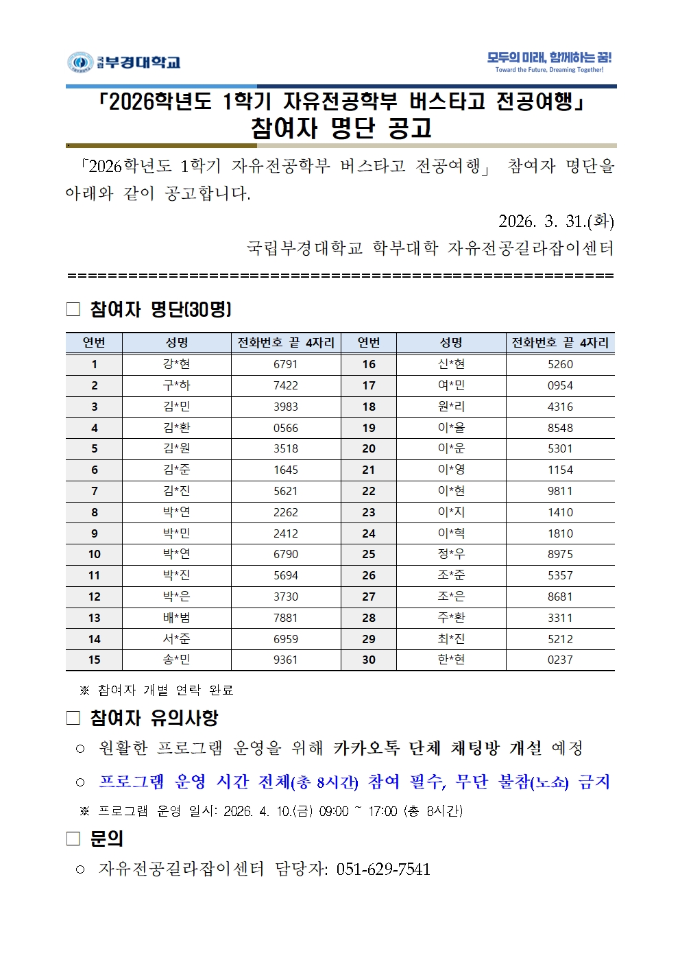 ○ 2026학년도 1학기 자유전공학부 버스타고 전공여행 참여자 명단을 아래와 같이 공고합니다. ○ 문의: 자유전공길라잡이센터 담당자, 051-629-7541